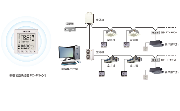 配備 86 智能型線控器,超大液晶屏界面,可顯示房間溫度、風(fēng)速等內(nèi)容,具有風(fēng)量設(shè)定、定時開關(guān)機(jī)功能。 可接入日立空調(diào)系統(tǒng)集中控制,實現(xiàn)與空調(diào)系統(tǒng)的聯(lián)動和集中控制,操作使用更方便、更智能。