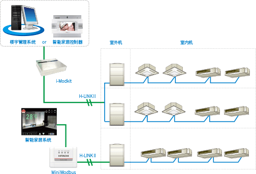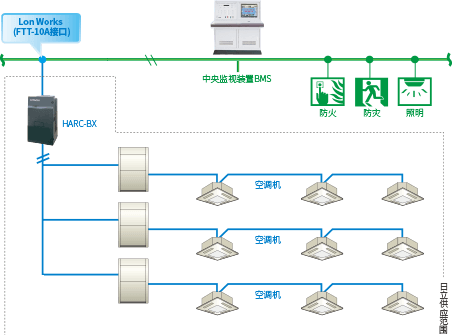 可以適用Lonworks、BACnet、MODBUS等多種網(wǎng)絡(luò)通信協(xié)議, 通過(guò)HARC-BX、HC-A64BNP或i-Modkit將空調(diào)設(shè)備接入樓宇自控或智能家居系統(tǒng), HARC-BX、HC-A64BNP和i-Modkit都可以連接64臺(tái)室內(nèi)機(jī)