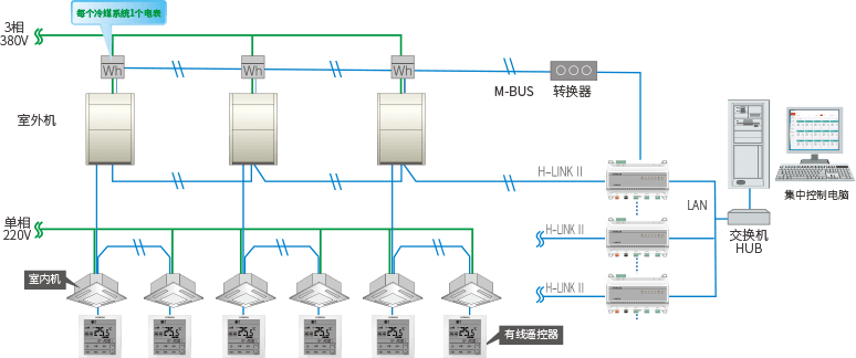 日立分戶計量系統(tǒng)由自動抄表系統(tǒng)和空調管理系統(tǒng)共同組成,以室內/室外機的運轉時間、能力大小、電子膨脹閥開度值等運轉數(shù)據(jù)為分配依據(jù),分戶計量軟件把電能表(安裝于空調機組電源線上)所測的總耗電量分配到各臺室內機上去。