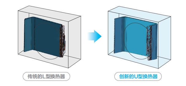 高效U型換熱器,270°全包裹設(shè)計,有效增大換熱面積,提高框體利用率,空調(diào)框體各空間得到充分利用,性能更優(yōu)異。