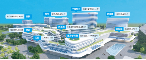 醫(yī)院人群構(gòu)成復(fù)雜,不同群體對空調(diào)溫濕度、氣流組織、噪聲要求不同;功能區(qū)域、科室眾多,空調(diào)系統(tǒng)形式及要求不同,使得整個系統(tǒng)非常復(fù)雜。