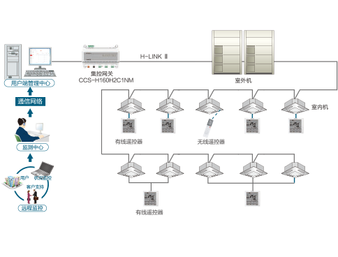 E-master Ⅲ 空調(diào)管理系統(tǒng)最多可管理空調(diào)室內(nèi)機(jī)數(shù)量達(dá)到5120臺。CCS-H160H2C1NM是E-master Ⅲ空調(diào)管理系統(tǒng)中連接電腦和空調(diào)的硬件(適配器),每個硬件最多可連接160臺室內(nèi)機(jī)。