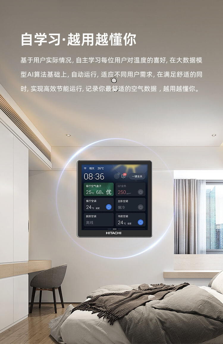日立智慧屏進(jìn)一步升級(jí),可實(shí)現(xiàn)空調(diào)、地暖、新風(fēng)、除濕、加濕系統(tǒng)一體化控制,也可獨(dú)立操控,高效便捷。系統(tǒng)間的聯(lián)動(dòng)控制可實(shí)現(xiàn)自動(dòng)化空氣管理,AI級(jí)智能調(diào)節(jié),復(fù)雜系統(tǒng)簡(jiǎn)單設(shè)定,一鍵運(yùn)行,使用無(wú)憂。