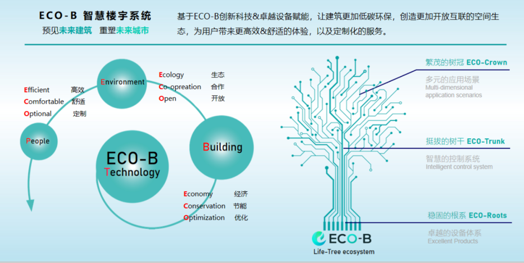 在具體場景應(yīng)用方面,ECO-B聚焦于建筑全生命周期各類人的需求,打造 ECO-B Air(空氣管理系統(tǒng))、ECO-B Energy(能源管理系統(tǒng))和ECO-B O&M(運維管理系統(tǒng))3大管理系統(tǒng),覆蓋企業(yè)商業(yè)、政府公建、教育培訓(xùn)、醫(yī)療衛(wèi)生、工礦廠房等5大領(lǐng)域,延伸19大行業(yè)場景,讓建筑運維更高效節(jié)能、讓空間設(shè)計更人性化、讓人的體驗更舒適,全面推進(jìn)建筑從智慧到生態(tài)到健康轉(zhuǎn)變,塑造智慧、綠色、健康的未來城市空間,構(gòu)建人類&空間的綠色生命共同體。