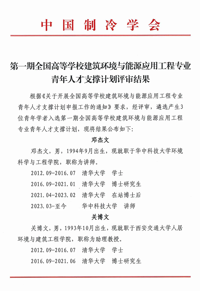 經(jīng)評審,鄧杰文、關(guān)博文、魏文哲三位青年學(xué)者入選第一期全國高等院校建筑環(huán)境與能源應(yīng)用工程專業(yè)青年人才支撐計劃。